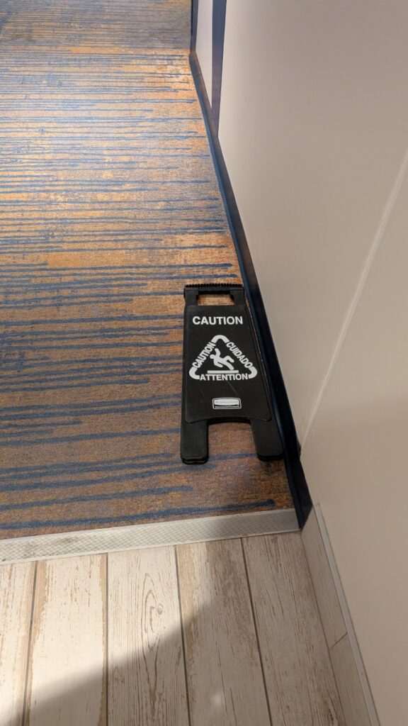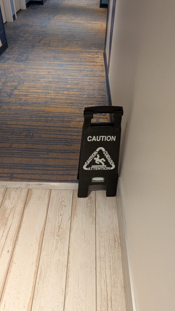 The first time I walked by this sign, I thought it warned of a wet floor (as they do like everywhere here in the USA). This would have been rather strange since it’s full carpet throughout the corridor (except at the elevators). However, I guess they warned about the very low threshold between the carpet and the wooden floor. And apparently, it was needed; someone missed the large sign and knocked it over.