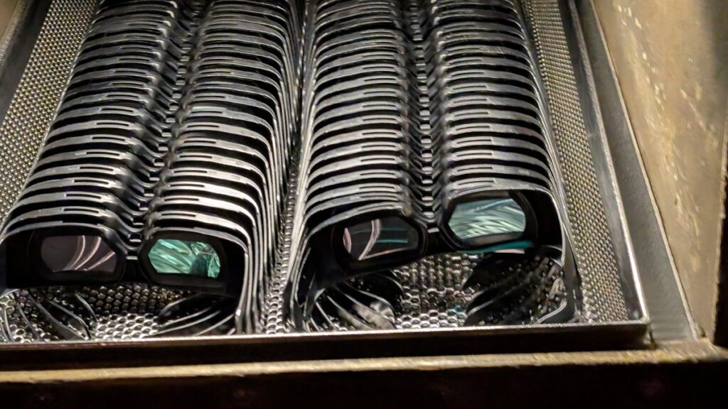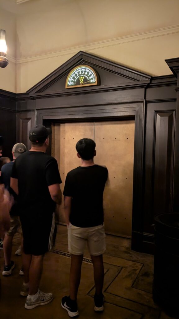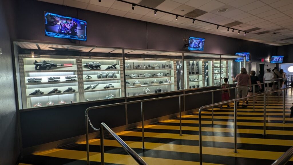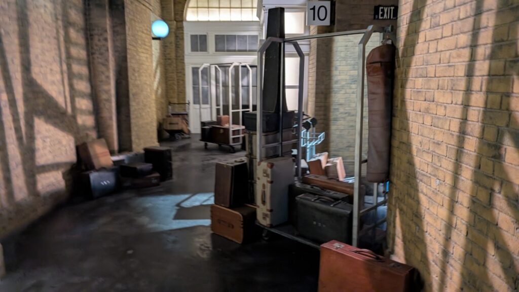 I got in line at 9, and it was clear that they put some real effort into the queuing area. Took just five minutes to get into the first room with a short holographic video clip to start off the story. Then an elevator ride “down” where the floor moved a bit up and down relative to the walls. Another corridor, grab some 3D glasses, and then up a stairwell, and finally jump into the carts.