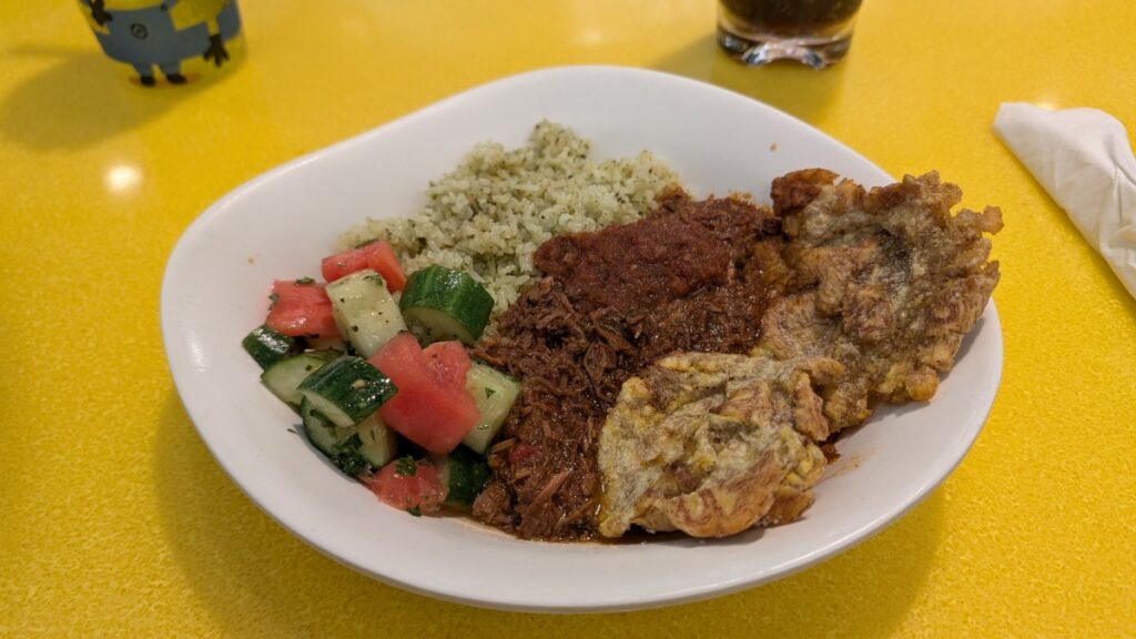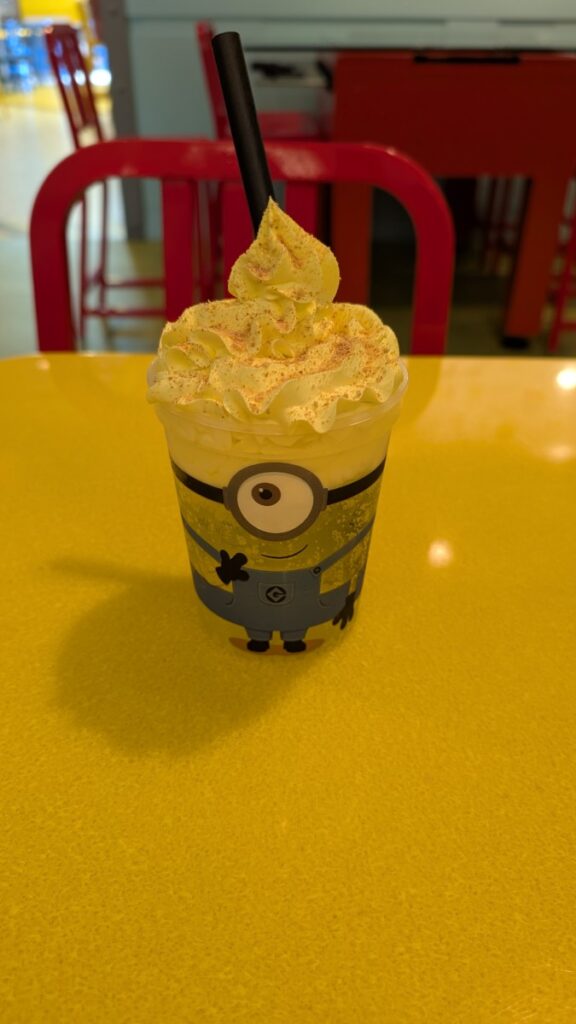 Just as I exited, my brother Peter called, so we talked for a bit. I went to pick up my bag again, but then so much time had passed that I had to pay $3 for the surplus time. Luckily enough, my wallet was in my pocket, and not in the locker. When we hung up, I went for the Despicable Me Minion Mayhem, the only ride that I had to queue for so far today. After 20 minutes, they announced that they had some technical difficulties. Where I stood, there was a staff member, and she entertained the two kids beside me. Right person at the right place! After a total of 45 minutes, they closed the attraction, and we got a single-use express pass as compensation. Shit happens, I went for lunch instead. The woman earlier, had recommended a Minion yellow soda, with banana flavour (of course). I got that with my lunch and it was quite nice. Told her as much when I met her later on.