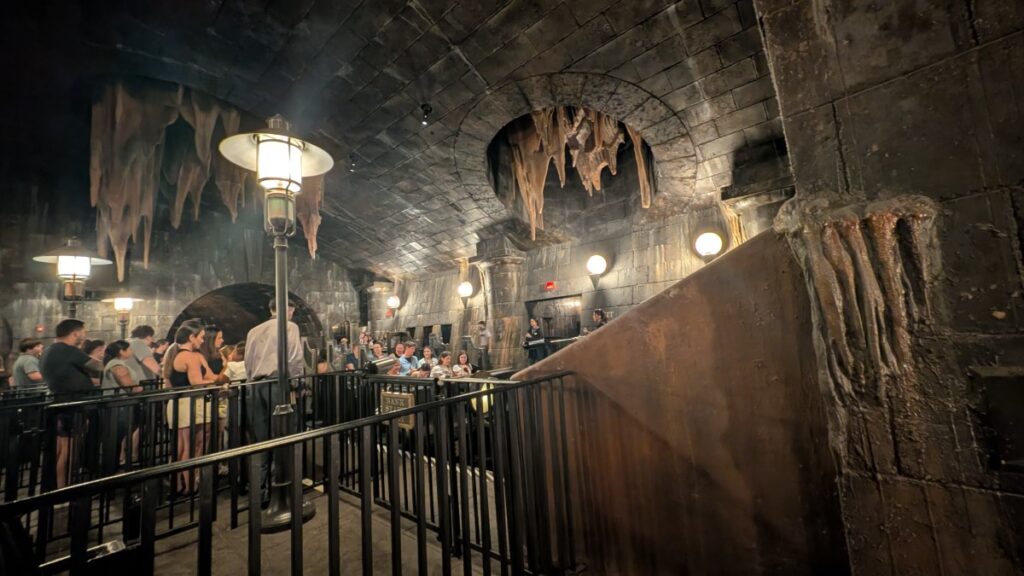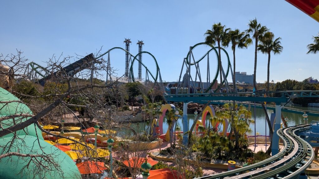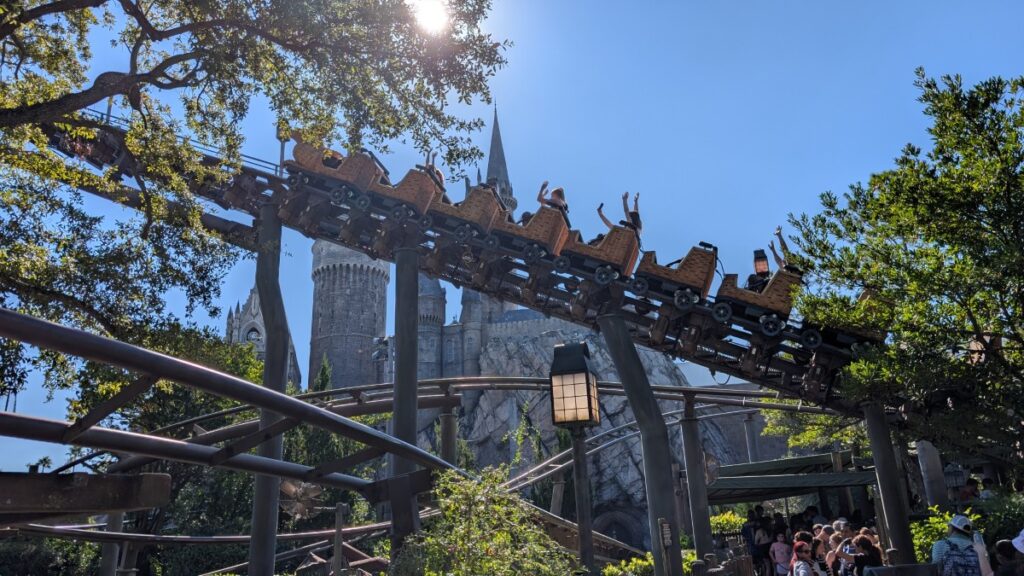 I arrived at The Wizarding World of Harry Potter and bought myself a butterbeer. Didn’t really know what I was expecting, but it was alright. The next stop was Flight of the Hippogriff. While in the queue, one train stopped in the first climb. After a few minutes, they were on their way again, then ran two laps without riders and then resumed operations. The ride itself wasn’t that bad, but the anticipation of the drop got me a bit.
