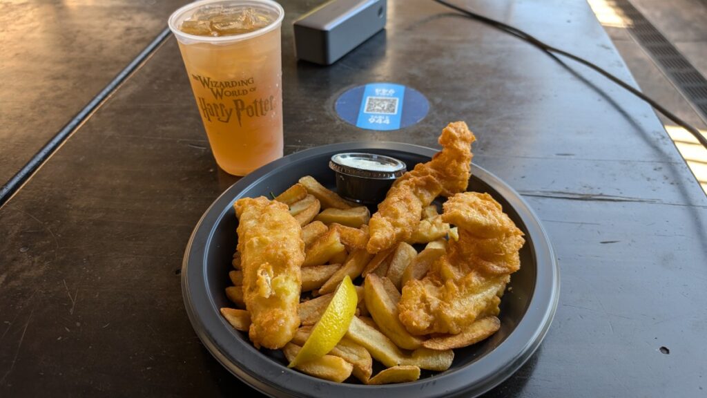 I had lunch at the Three Broomsticks, Fish and Chips with an apple cider, outside next to the water, quite nice. At the table next to me, there was a girl sleeping on the bench; she seemed exhausted. Her friends sat, however close by, and had her under supervision.
