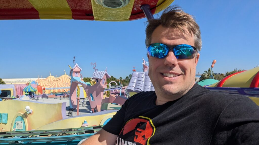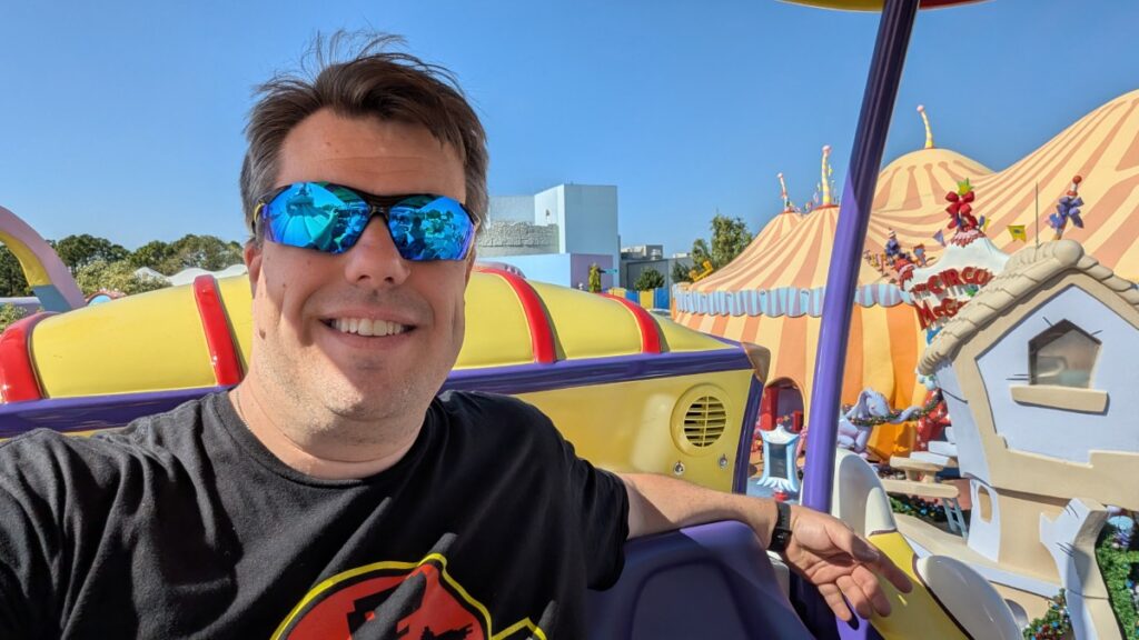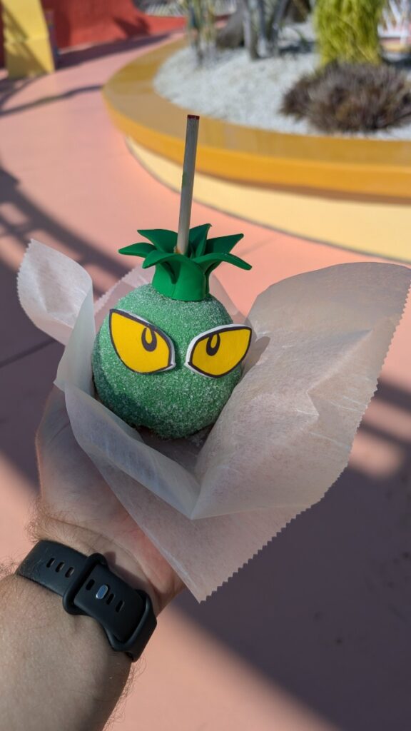 Kept strolling through the park and ducked into The High in the Sky Seuss Trolley Train Ride. A slow ride over this part of the park while talking about the alphabet (I think, didn’t really listen). I took the opportunity to get another perspective and take some selfies. You exited the ride through a sweet shop, and I fell for a Grinch apple. Looked like a real treat, but it was an ordinary apple, with some marzipan (or similar) and frosting. Well, the apple was good but not what I had expected 😛