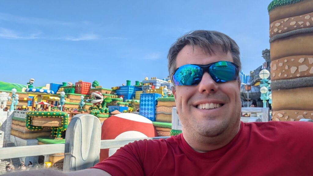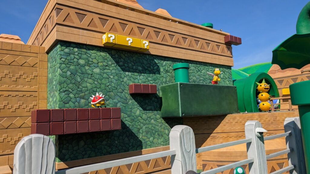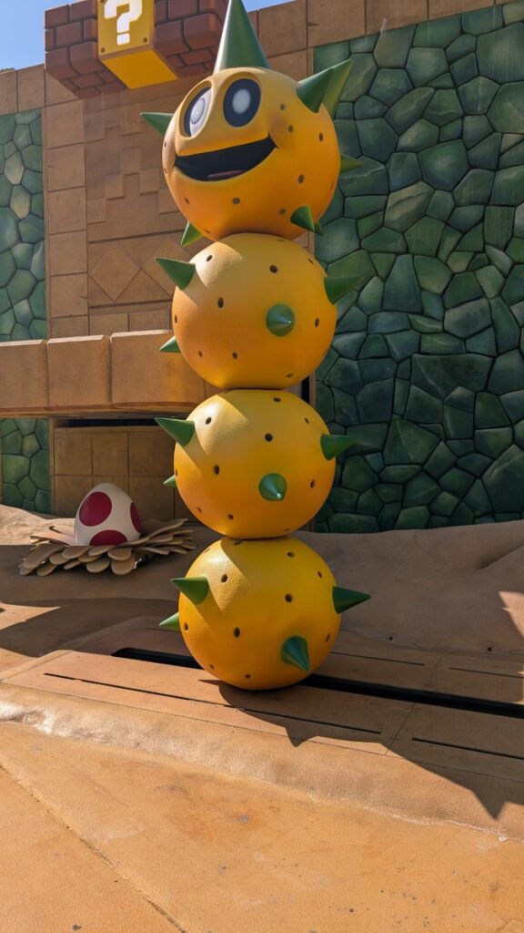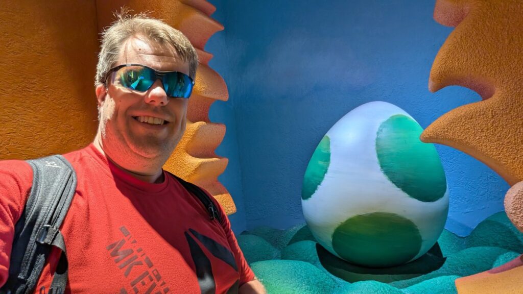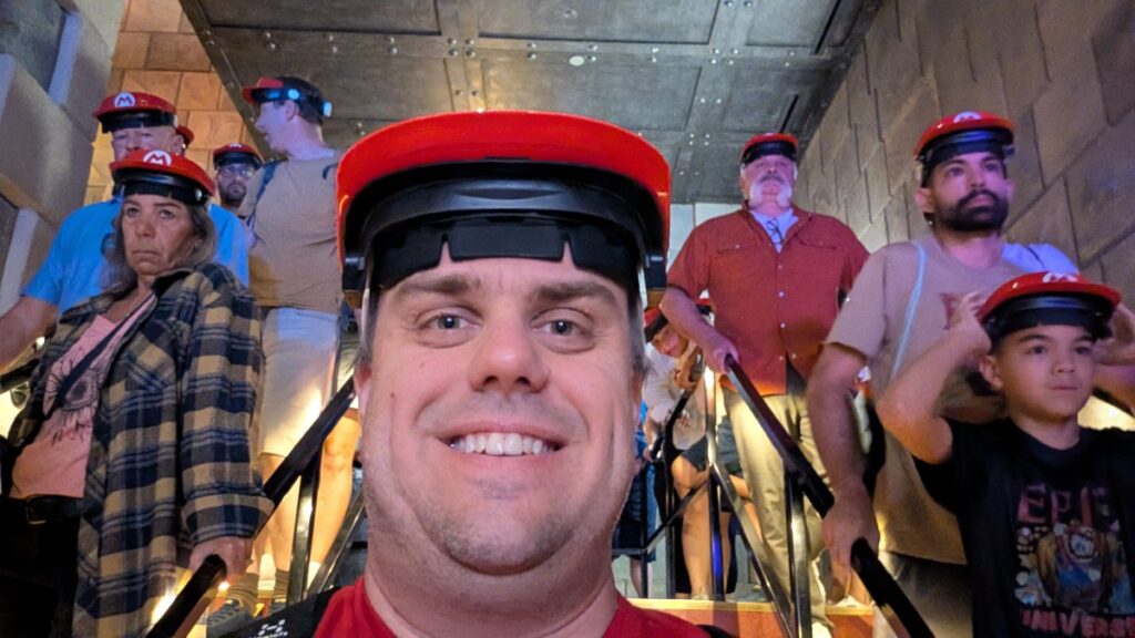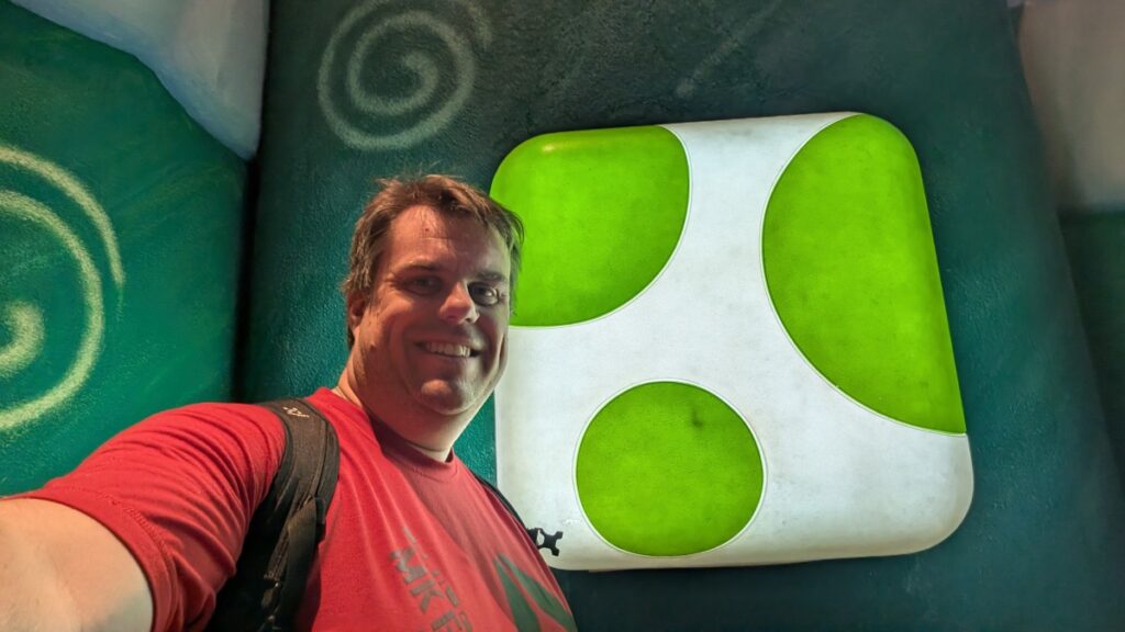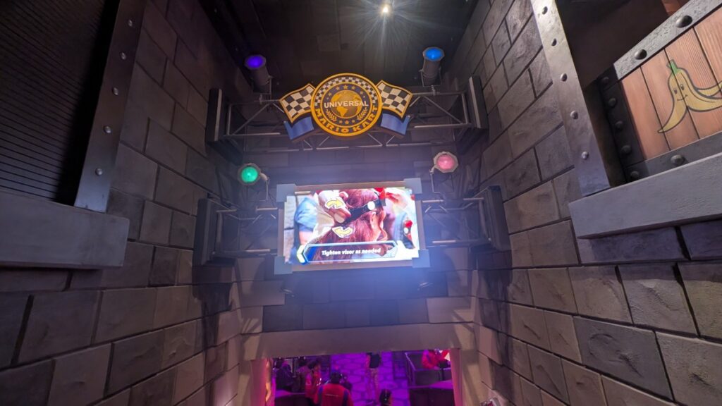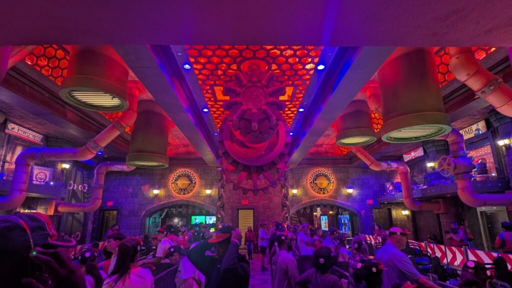 Walked on through Celestial Park and entered Super Nintendo World. This was really crowded; it seems like they built it too small to begin with. I went for the main attraction first, Mario Kart: Bowser’s Challenge. Very nice scenery to queue in, but it’s still queuing. The only positive thing about stairs in the queue is that you can easily sit in them, which the woman in front of me did as soon as she could. Had about 20 minutes in the single rider queue before getting to the front. Just for the ride to have some issues, so they had to unload everyone. Just took a few minutes before they were up and running again. While waiting, I noticed that most of the staff have headsets, and they look just like the ones you have at the drive-in at McDonald’s.