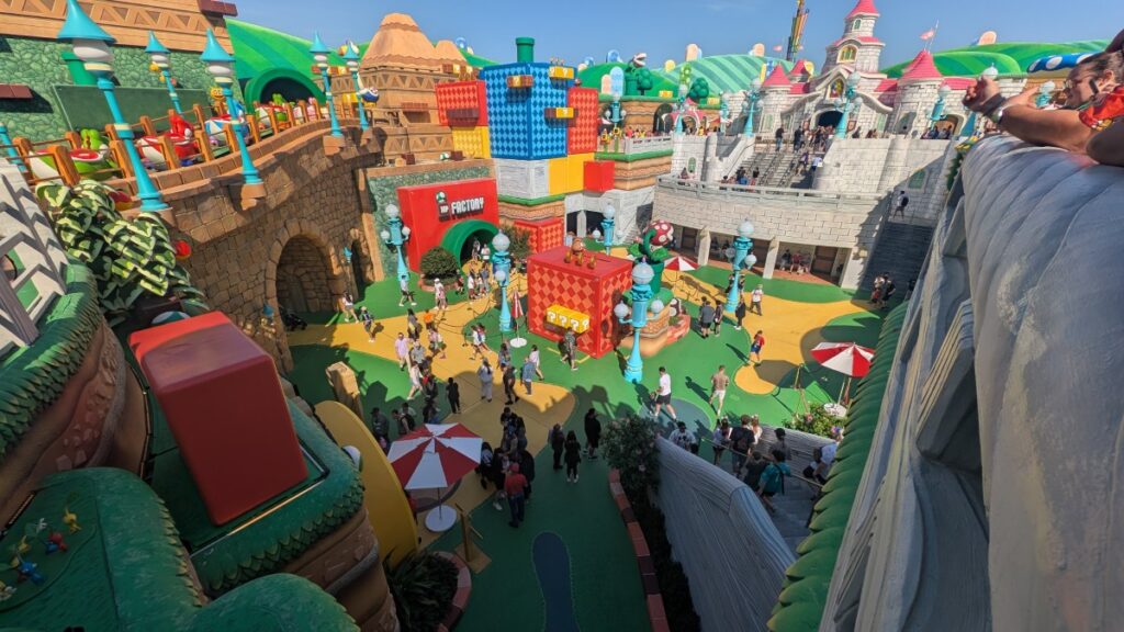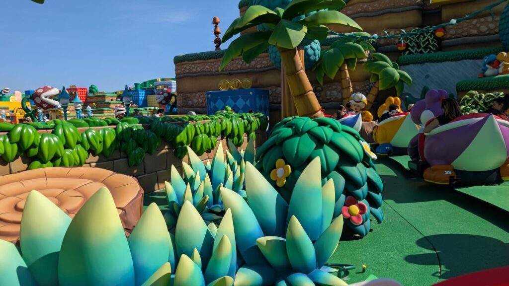 I don’t really know why, but I joined the queue for Yoshi’s Adventure, even though the expected wait time was 75 minutes. It ended up at about 65, a really slow ride with very tight seats and a safety bar, which I didn’t really understand why. There was one “drop”, like 50 cm over a distance of five meters. Not worth the wait, I spent the time taking a few pictures from the elevated position in the zone.