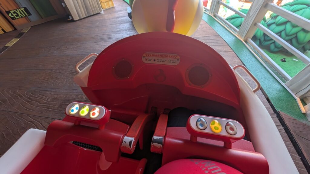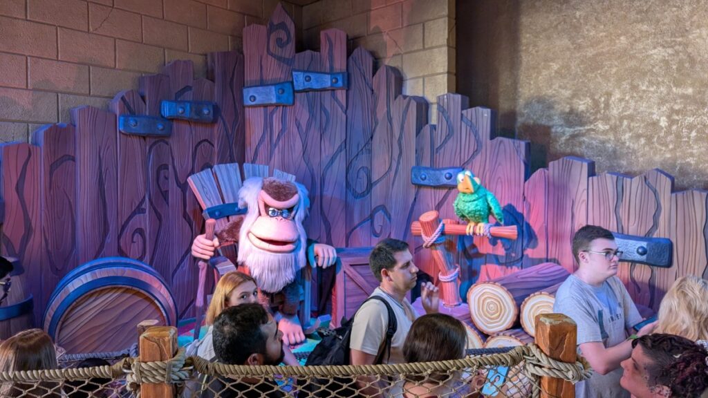 I moved further into Donkey Kong Country and started queuing for Mine-Cart Madness. Just as I was about to enter the single rider queue (standard entrance had an estimated 175 minutes), they closed it, but she let me in. Not sure if she did me a favour though. It took me about 70 minutes to get to the front. The guy behind me (who entered after they opened it again) waited just about 20 minutes. During the whole time I was in the queue, they played the same 30-second soundtrack containing two different lines (one sentence each) and some music. Anyone queuing spent at least 30-60 minutes in this, couldn’t they have produced something more varied?