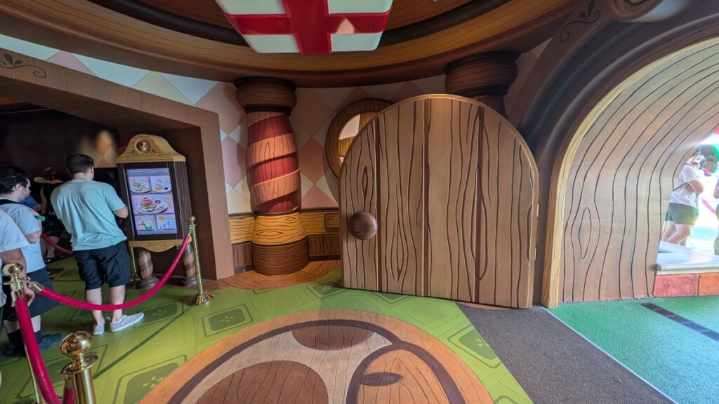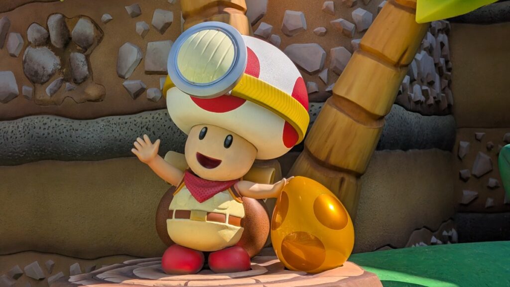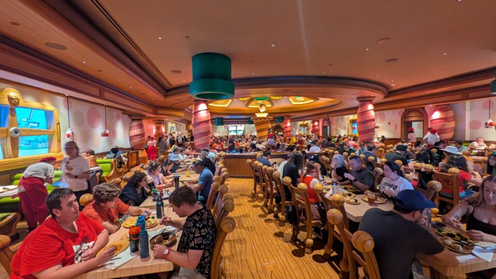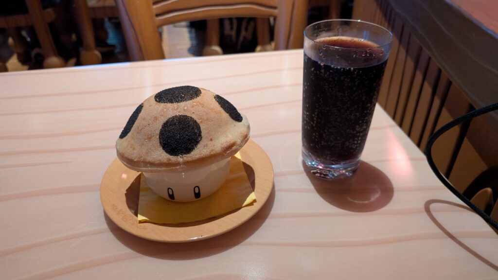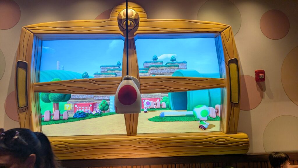 I had gotten hungry, so I went for some lunch. I read someone recommending Toadstool Cafe, and since I was “in the zone”, I placed an order for Super Mushroom Pizza Bowl and some soda on the app. However, I needed a table number, so I had to get in line. It took 25 minutes before I had passed through the queue, gotten picked up by the waitress, and been shown to a table. Or, she pointed, “sit down at the table over there”. I thought we were a total of four sitting together, but they took another table and I got alone at a four-seater.