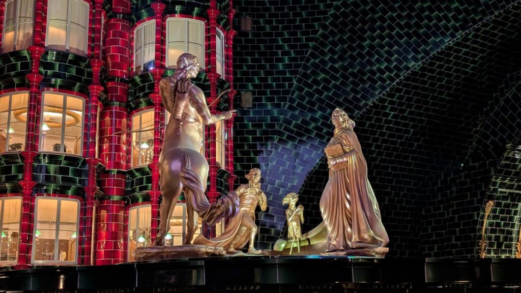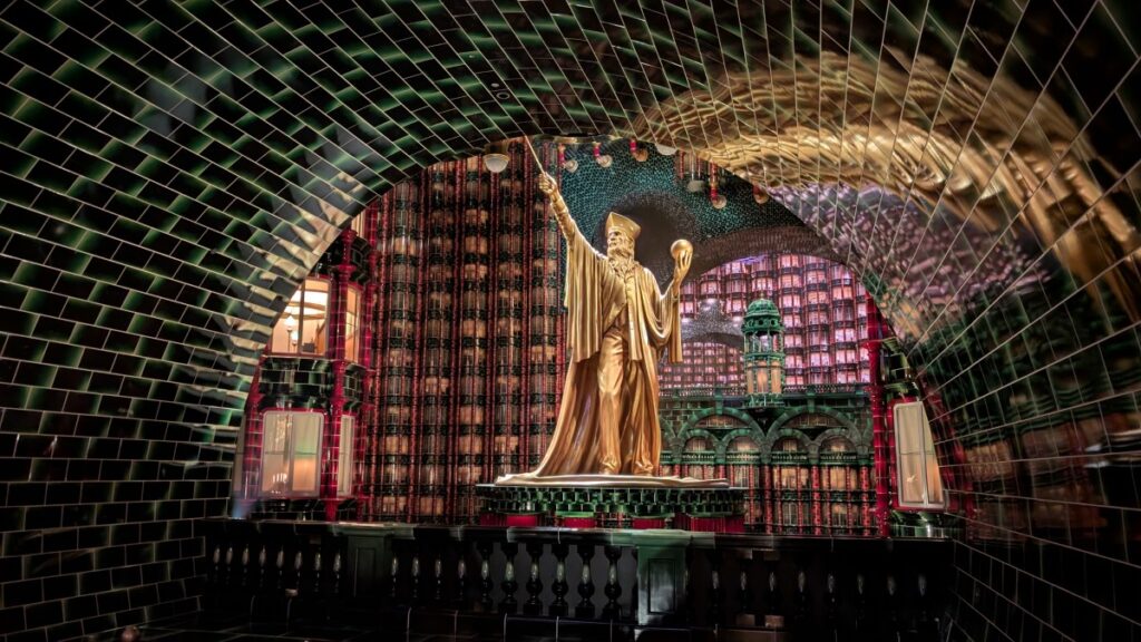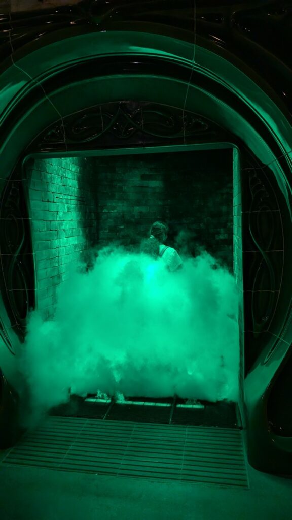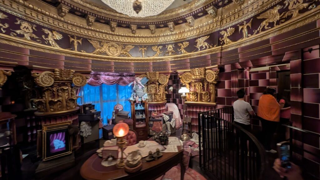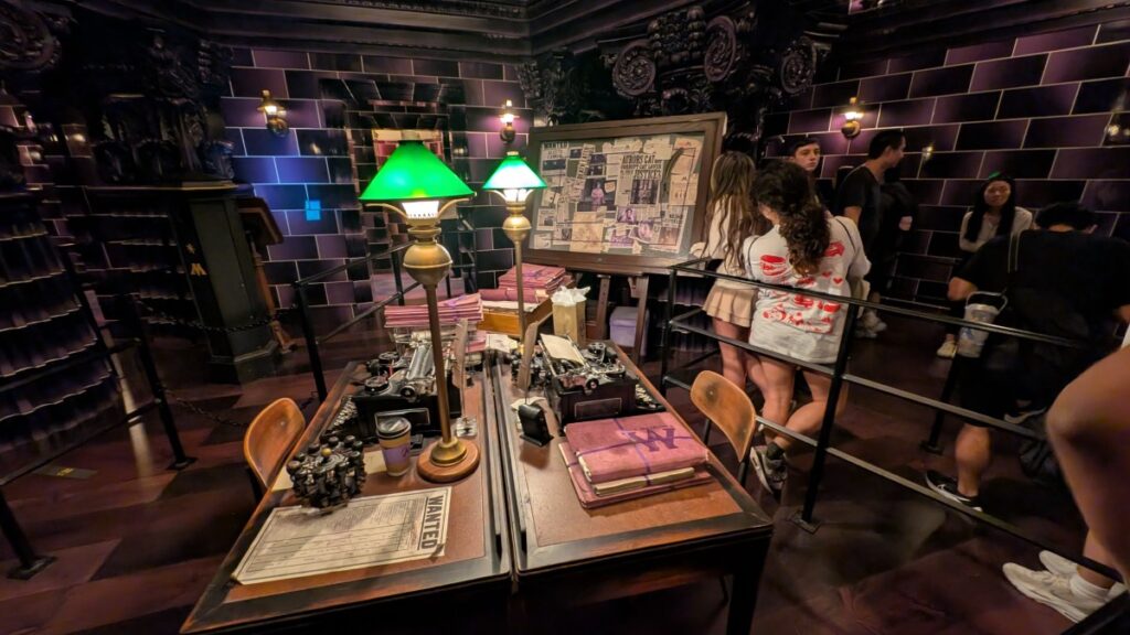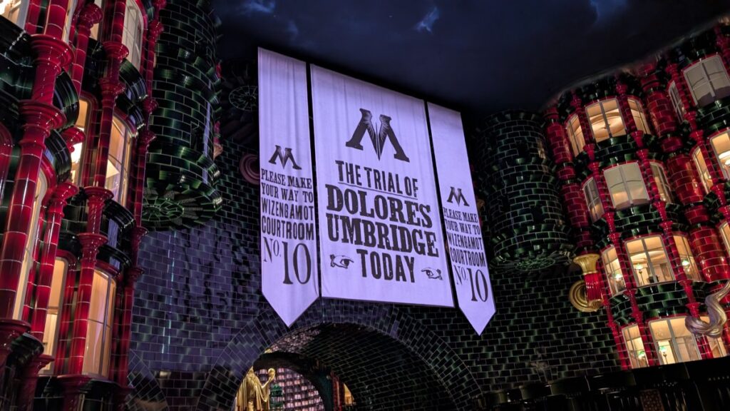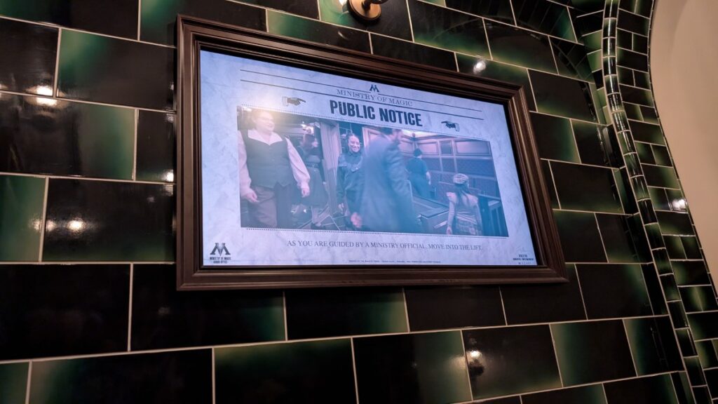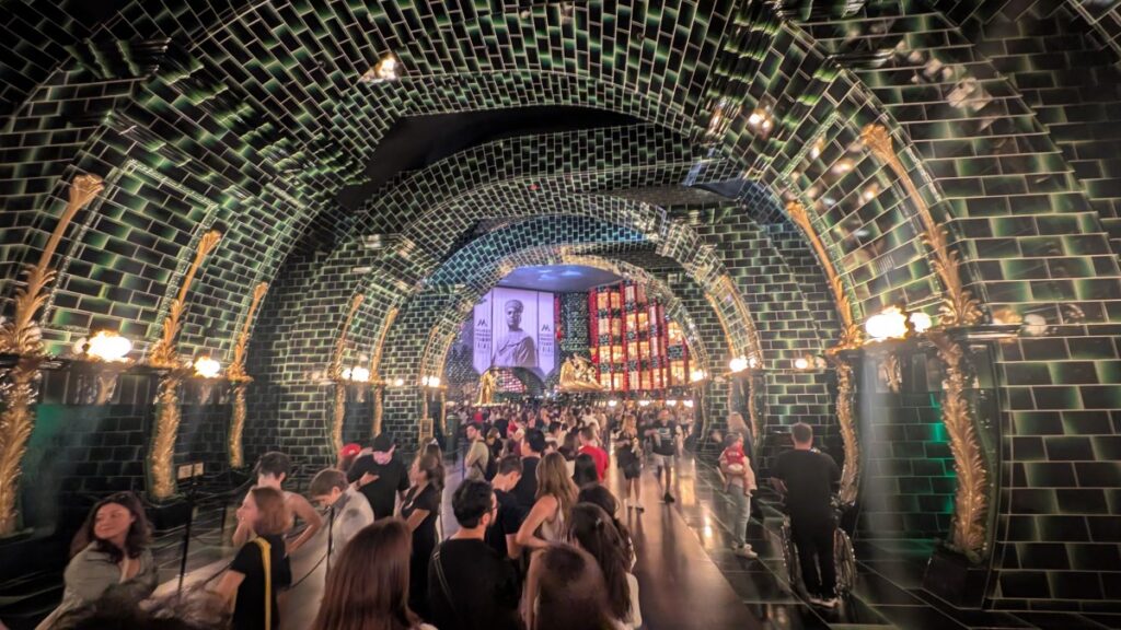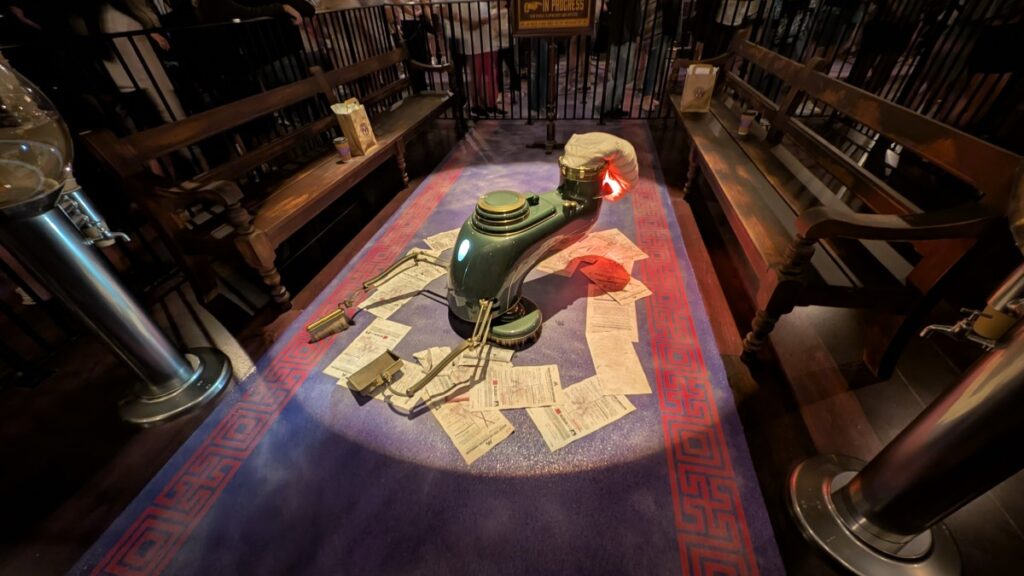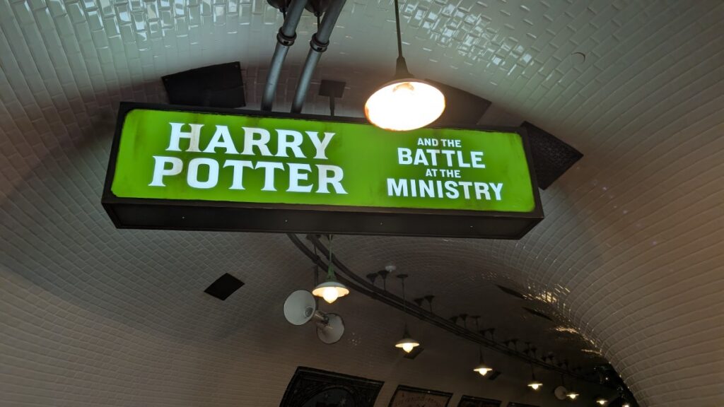 I wanted to do the Battle at the Ministry, and I had seen a sign saying that it would close early, so I headed over to get in line. I was uncertain if I should go for single rider since the estimated wait time was 210 minutes. On the other hand, in Escape from Gringotts, you miss out on a couple of things if you do single rider. In the end, it didn’t matter because the single rider was closed. I entered the queue at 15:10. After 100 minutes, I reached the first checkpoint, “traveling by floo powder”, and entered the lobby of the “Ministry of Magic”.