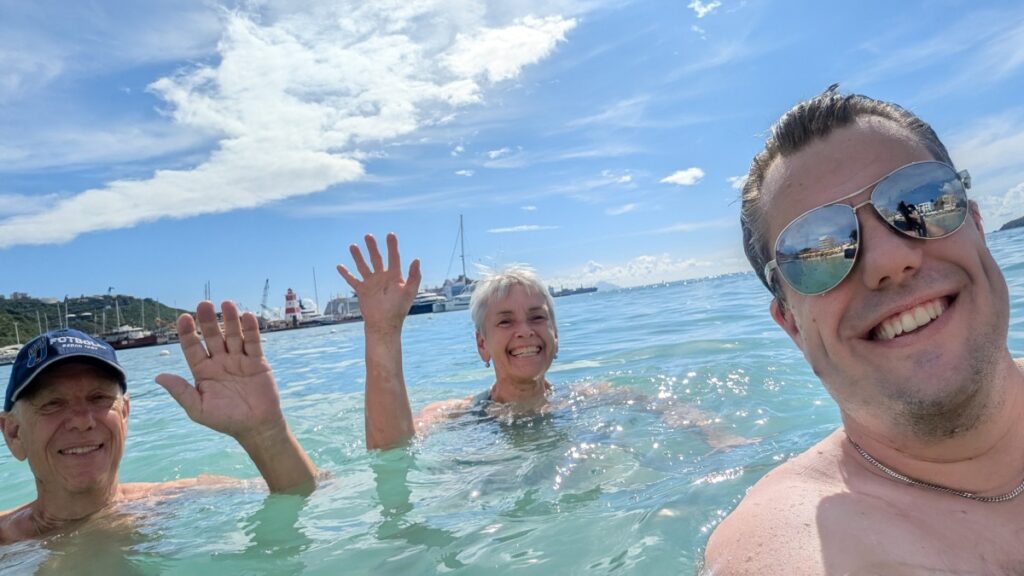 We decided it was time for a swim, so we walked down to the beach, found a spot close to the water between all the sunbeds you could rent, and put our stuff there so we could see them. I packed my little waterproof pocket with my passport and cellphone and brought it into the water. This way we could take a picture while in the water!
