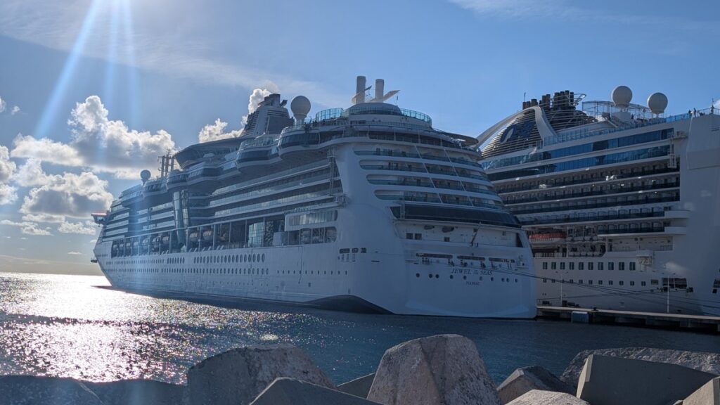 No warship alongside today, but three other cruise ships, I think I was on the smallest one. I went back to my cabin to grab my little camera and headed up to the helipad that is just outside my window.