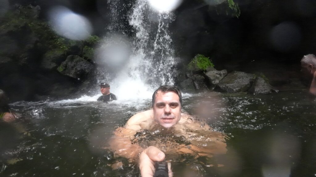 First up was the Emerald Pool, up in the mountains, rumored to be a fountain of youth. Since I turned 40 this summer (which is the motivation for this trip), it’s time to start looking into such options. At the parking lot, there were some facilities, like a kiosk, restrooms, and a ticket office. A man in uniform, I don’t know if he was police (Dominica doesn’t have any armed forces), collected the tickets, and then we walked on a nice path a few steps up and down, across a bridge, all while engulfed in vegetation, and then got to the pool.