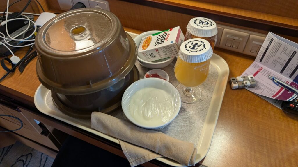 Today I tried room service to not have to queue in the buffet since I had a time to adhere to, 8 o’clock in the main theatre for the excursion. I had the alarm at 7, and had booked the time slot 7-7:30, so just before seven the phone rang, and they gave me a few minutes’ heads up, breakfast inbound! A cautious knock on the door, and there a woman stood and handed over a tray. I guess it’s even nicer if you have a balcony to eat it on. Anyway, it saved me some time and was sufficient.
