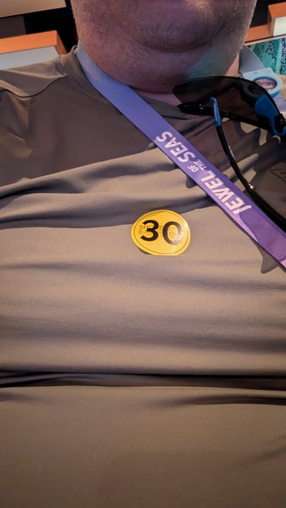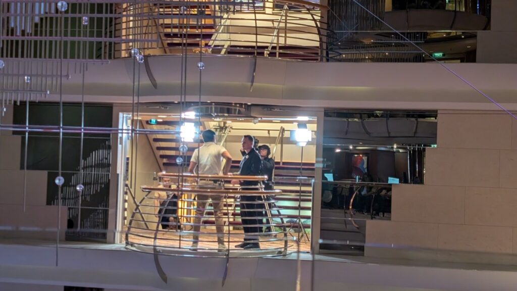 Went back to the cabin to get my laptop and then sat down in the centrum column listening to live music while doing today’s post. Across the open space, they set up a TV camera, and a guy in a hat recorded something. I walked by later and asked, and it was for the morning show. I wonder if that is shown on the TV. I haven’t turned it on since the first day.