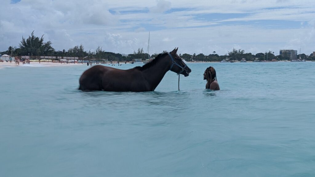 I spent an hour in the water. First, I tried to sit down and read, but the waves hit too hard and splashed water on the screen. The eReader is waterproof, but the water drops started to flip pages for me, and that got a bit disturbing. There were two different sets of horses, one group that you could pay to get on and then ride while the horse was swimming, I guess. Then another guy who had two race horses and one part of their training was apparently to have them swim. The trainer was very polite and told me I had a safe distance, and he took his horse around me.