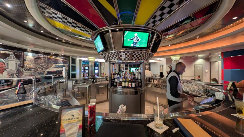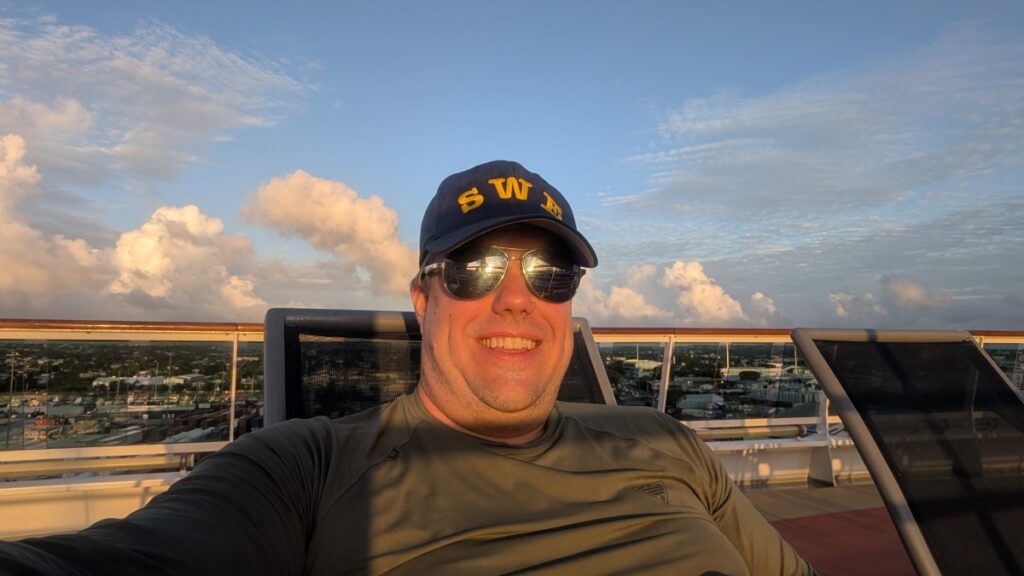 Got on board and took a shower. I needed to get rid of the sand I collected in the waves at the beach 😀 I brought my laptop and went up ot the Solarium to watch the game between the Detroit Lions and the Green Bay Packers. At the pizza stand, I recognized Tom from Sunday and asked if he would watch the game, and he told me they showed it on the big screen at the pool. So I quickly packed up my stuff and went outside, and grabbed myself a seat at the bar.