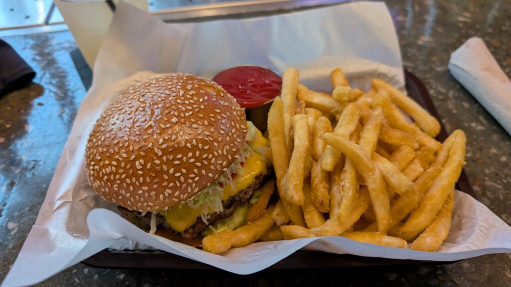 I spent another 30 minutes before heading back to the hotel, where I did some research on tonight’s dinner and a tour of the AT&T Stadium for tomorrow. I booked an Uber to go to the American Airlines Center. The driver was very nice and had a couple of suggestions on what I should do in Dallas during my stay. Before getting into the arena, I went to Hero, which is at the same plaza as AAC. I got myself a burger and a mocktail. The waitress asked me if I wanted to open a tab, and I said Sure. However, as soon as I had eaten my food, she closed it and came with the bill, so no second drink for me. Felt a bit stumped.