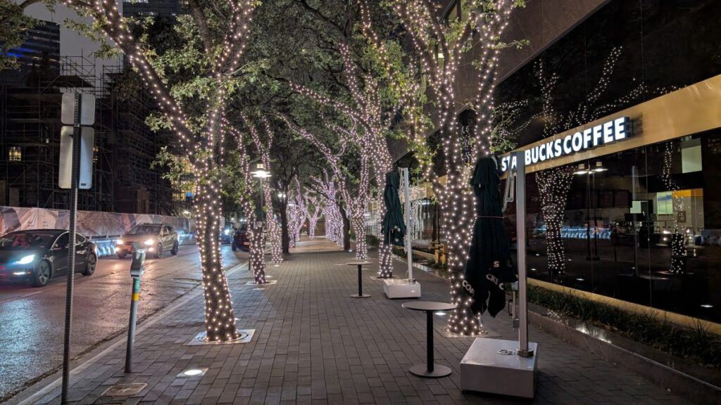 I had planned to take an Uber back to the hotel, but walk a couple of blocks first to skip some of the traffic and make it easier to find my driver. However, when I checked again, the price had tripled compared to what I paid before the game. Since it was only a 25-minute walk, I kept walking. Found a nice colonnade on the way.
