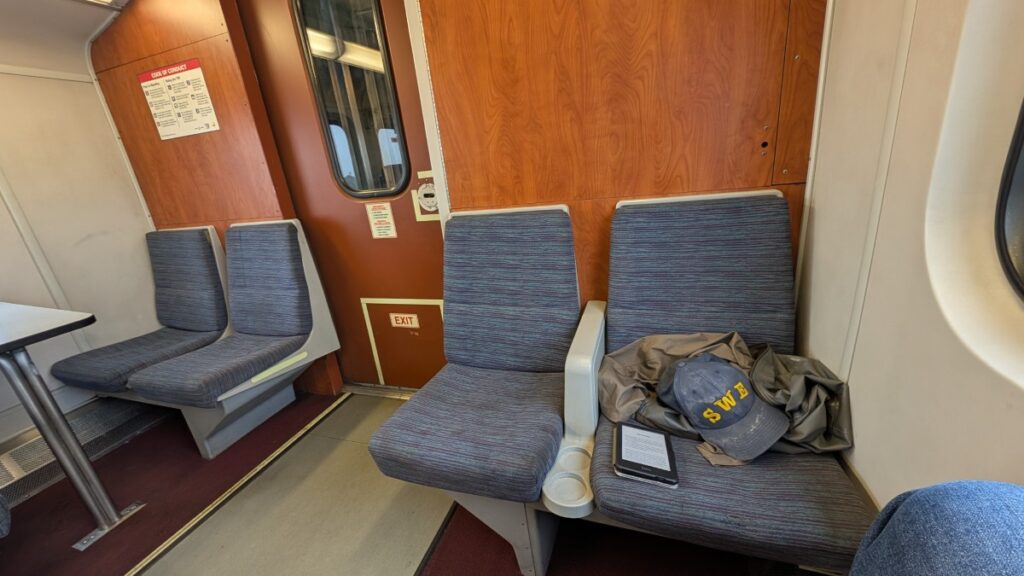 The signs on the station said that the train would depart from track 3; however, a train that looked very much like mine was standing on track 4. I found a guy to ask, and he said something about how they had made a switch. So I got on and could escape the cold winds. The train departed on time at 9:15.