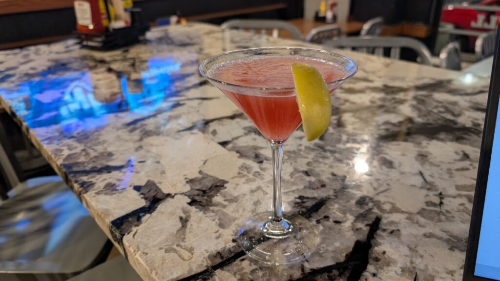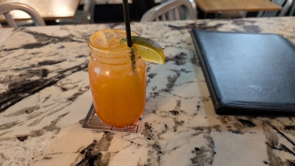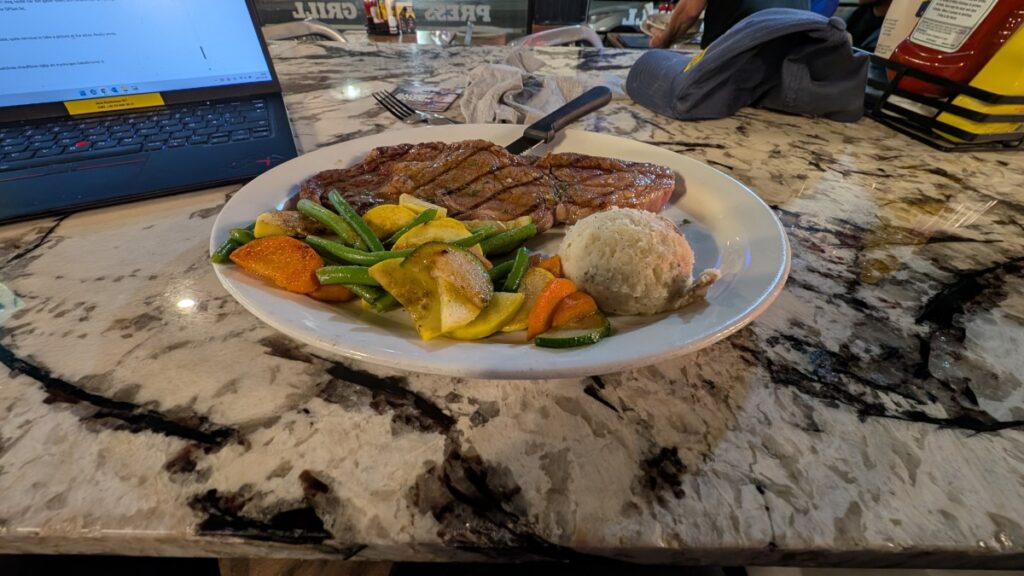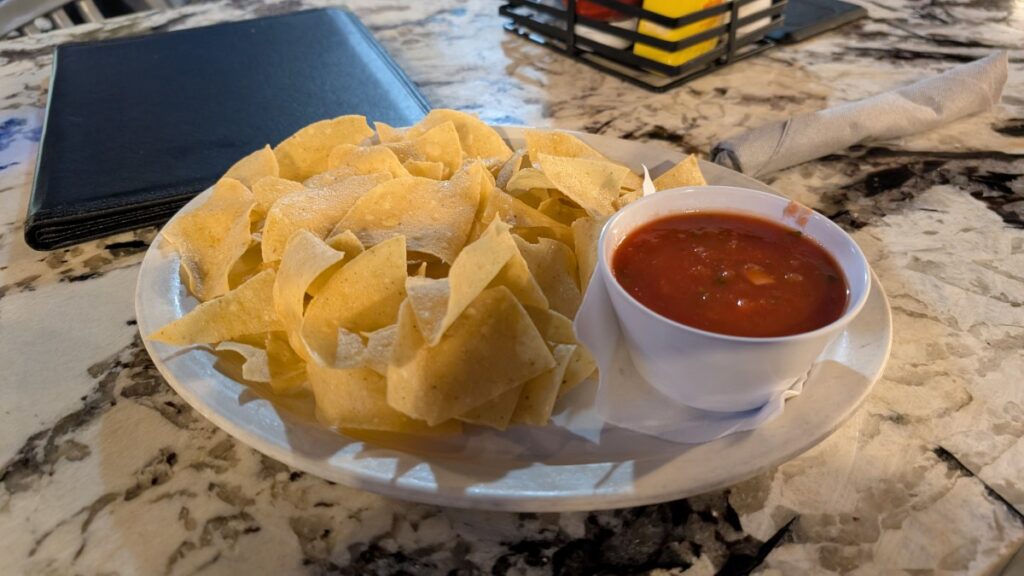 I went for both mocktails, nacho chips with salsa, and a ribeye. The chips were quite bland, but the salsa was spicy. The meat was quite salty but otherwise tasty. The place was about half full, mainly cheering for the Cowboys, of course.