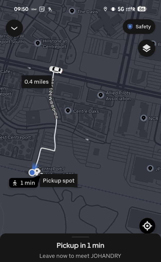 Started to look a the trip back. The price for the Uber had gone from $10 to $35. When I checked the price for going all the way to Dallas, it was $50 (and much quicker than the train). I had seen the signs and ads from Lyft, so I downloaded the app and checked. They had the price of $10 for the trip to the train, so I booked that instead.