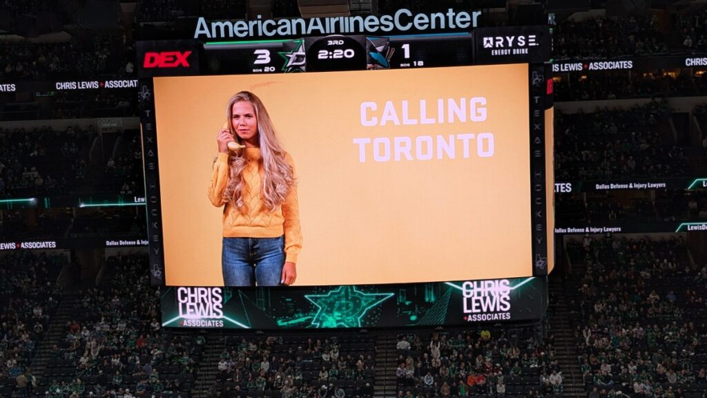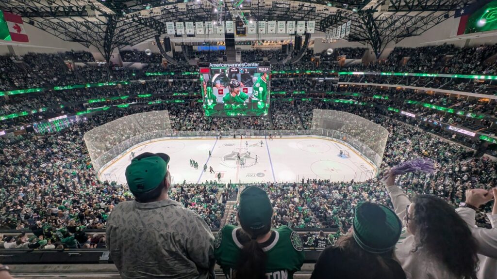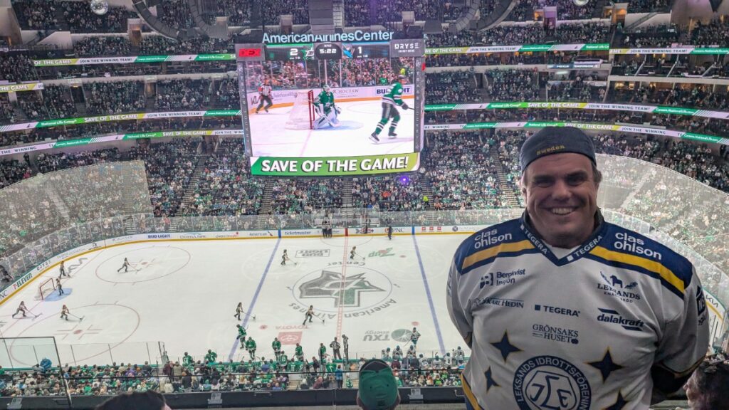 I put on my Leksands IF jersey and headed into the stadium. I asked about the belt this time, and I could keep it on. I realized that the souvenir shops were the same as during the Mavericks game; however, they were now filled with Stars stuff. So I guess they pack and unpack everything for every game. Lots of work!