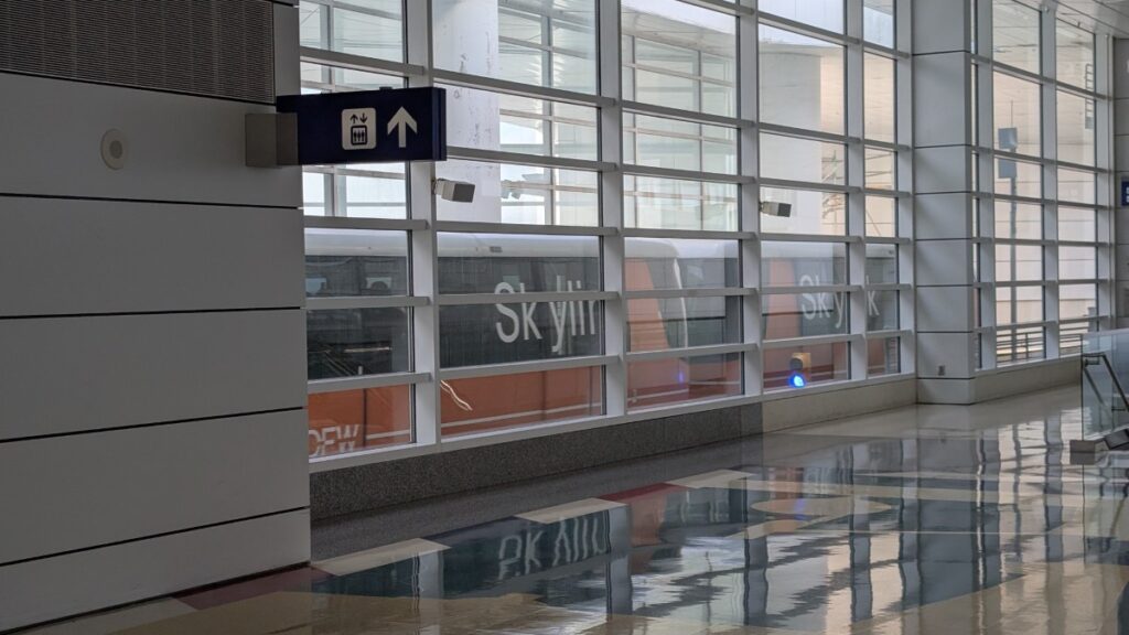 I took my bags and walked over to the train stop where I would take the Orange line to the airport, but I stopped on the way at a Chick-fil-A for some lunch. The train departed at 14:00. Just over an hour later, I had arrived at the airport, dropped off my bag, and passed through security. Then I took the Skylink to go to Terminal D. A driverless train that runs pretty fast, the trip took just a few minutes. Smooth!