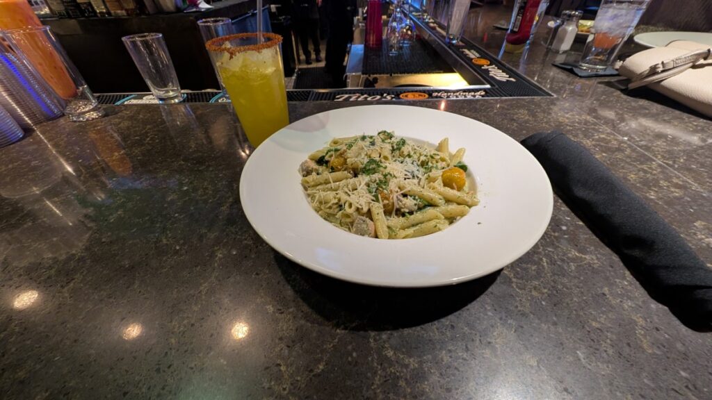 Google Gemini had recommended I go find dinner in The Linq Promenade, which is just around the corner from my hotel. So I took off and found Off the Strip. Sat down at the bar and ordered a Pasta Pesto Salmon, and the bartender fixed me up with a great mocktail. The food was great, and I ate pretty quickly. I wanted to explore more!
