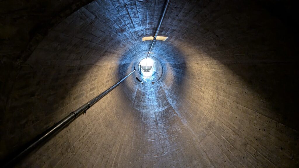 However, our first stop was a tunnel, whose primary function was not for tourists but to provide ventilation for the inspection tunnels. We could look out through a vent on the south (dry) side of the dam. Didn’t want to lose the grip of your phone/camera there…