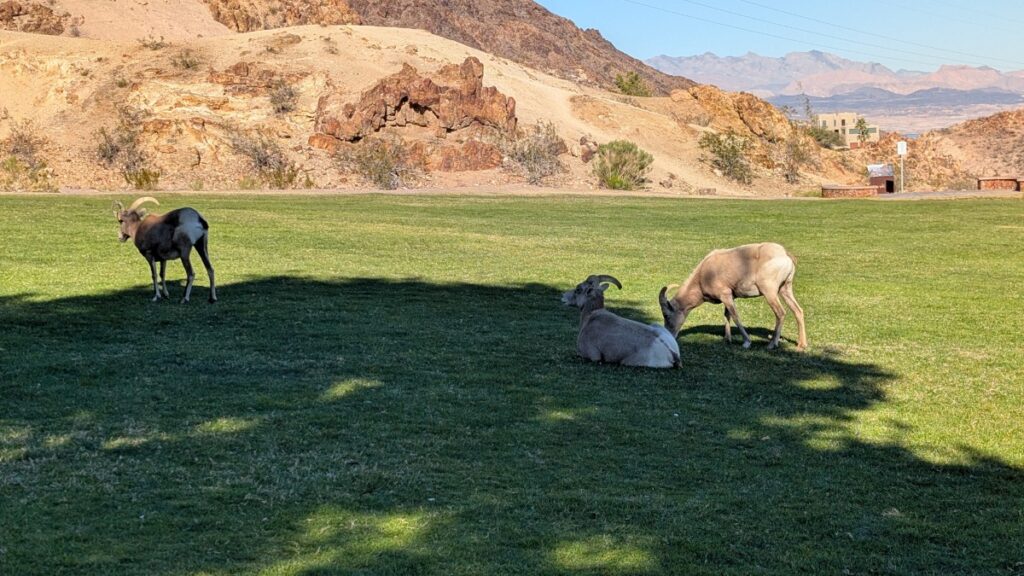 I got to Boulder City and found the park. Not sure how and why the animals stay there, though, no fences and no apparent feeding apparatus. Maybe it’s the only green grass there is in the vicinity?