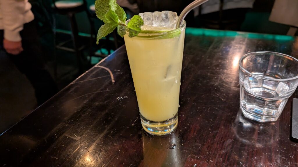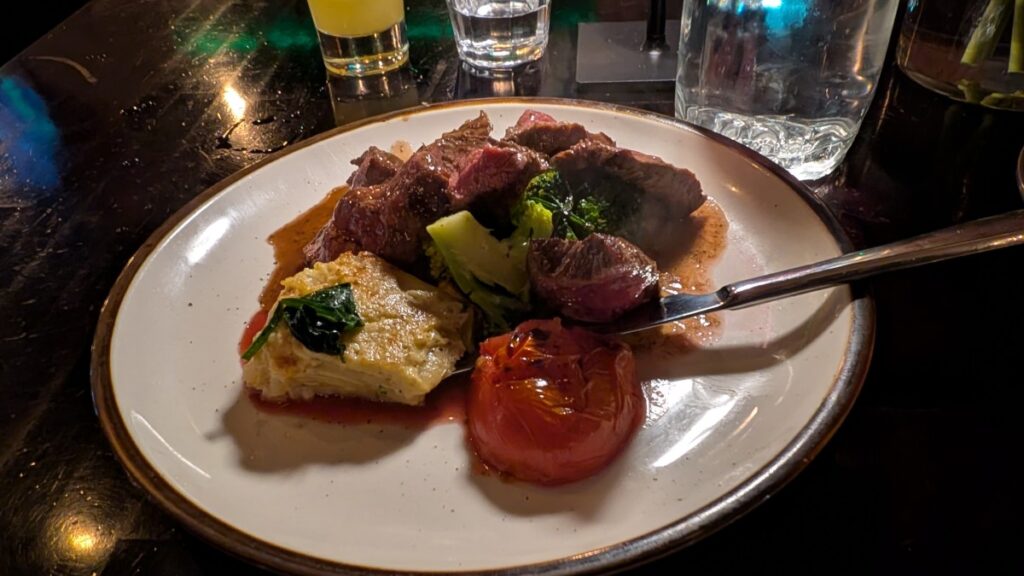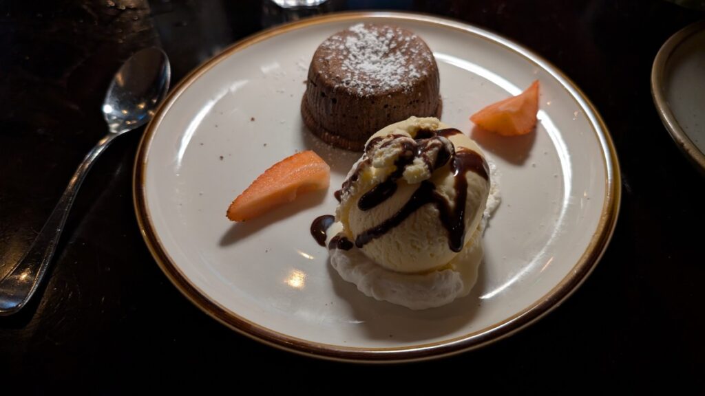 I went to the same place as the day before yesterday, Ti Piacera. I got one odd table in the middle of everything. No live music tonight, but quite loud. I asked about their mocktails, and I got a mango-based margherita (I think). Then I ordered the Bistecca and the Lava cake for dessert. The food was delicious, and it was, all in all, a very nice last meal in San Francisco.